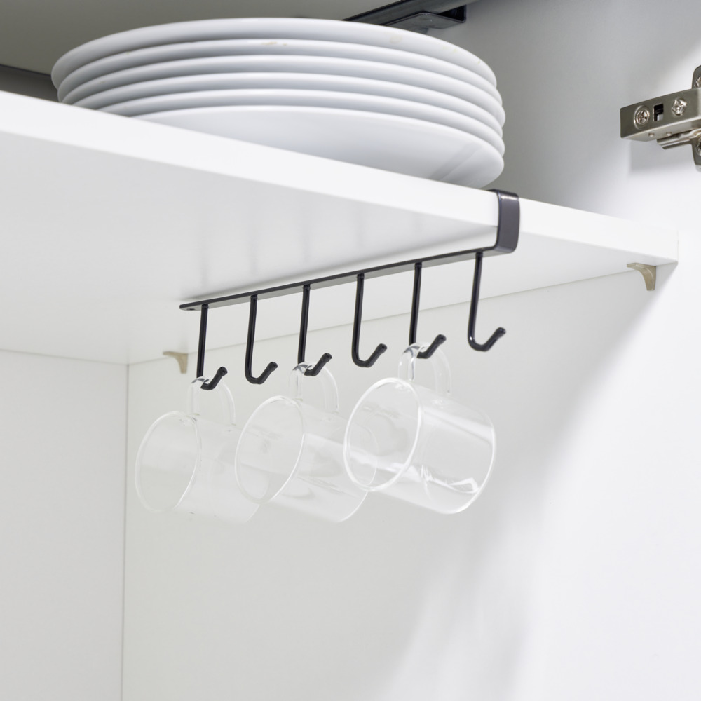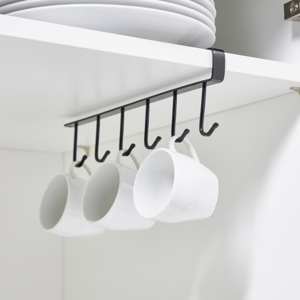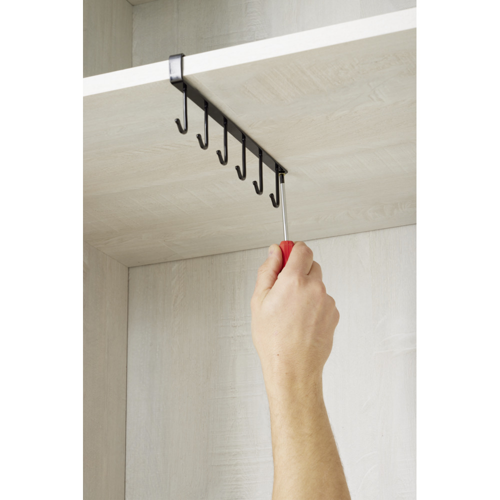 Featuring 6 hooks, this organizer easily attaches to the bottom of your closets to provide practical and attractive hanging storage.