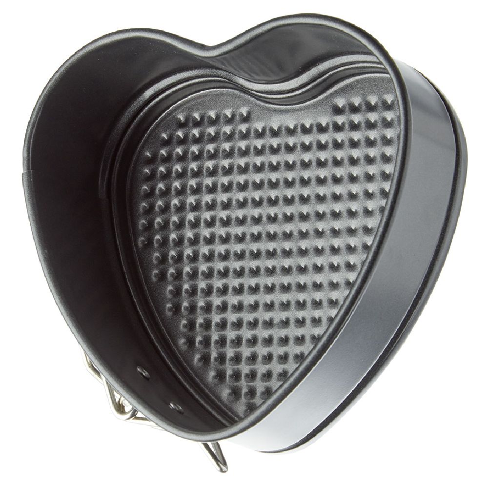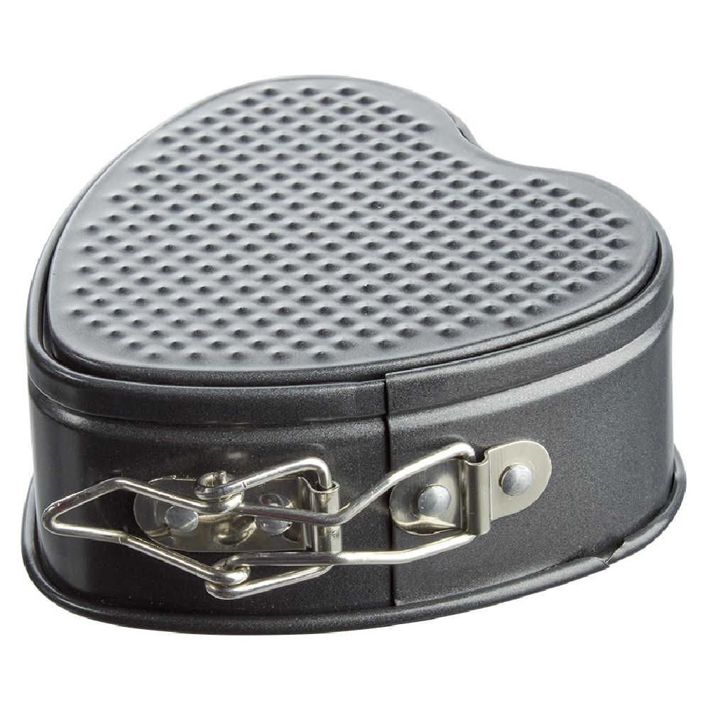Heart-shaped cake tin in grey metal with hinged opening/closing system for easy removal.