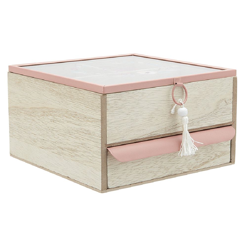 Jewelry box with 3 compartments and 1 drawer in natural and pink color.
