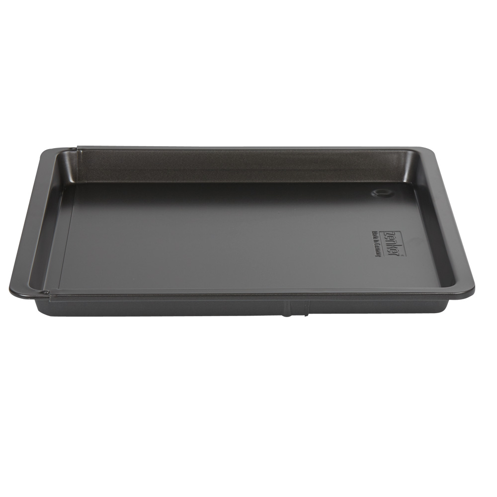 Rectangular steel baking tray with non-stick coating, ideal for baking delicious homemade cakes and biscuits.
