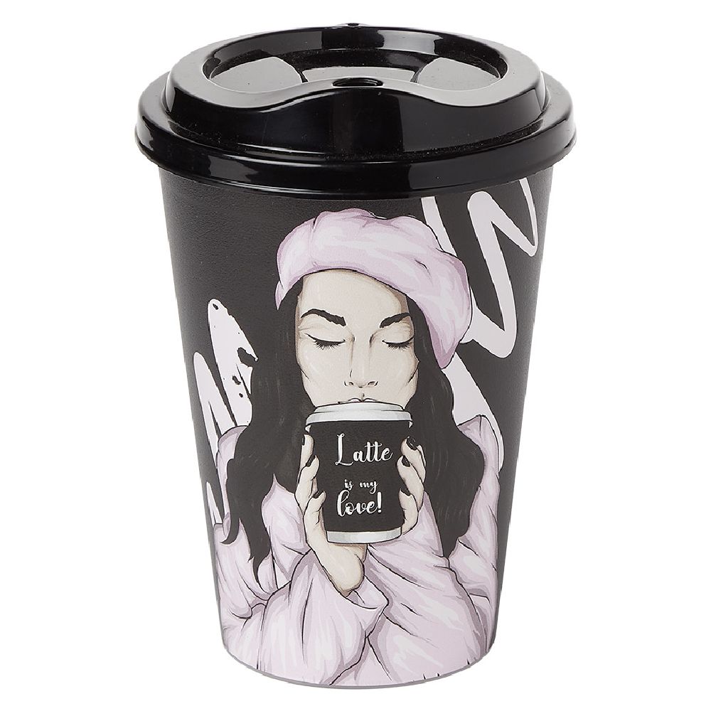 Trendy patterned plastic mug with a plain black lid, ideal for drinking your hot and cold drinks.