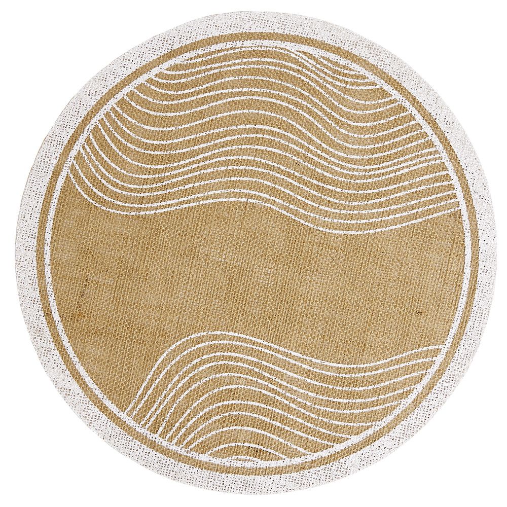 Bring an elegant and rustic touch to your kitchen or dining room with this round 100% jute placemat in natural color with white patterns.