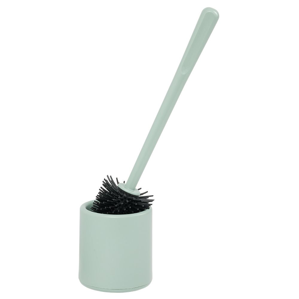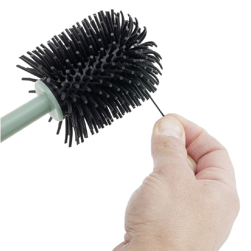Toilet brush with black silicone head and green plastic holder.