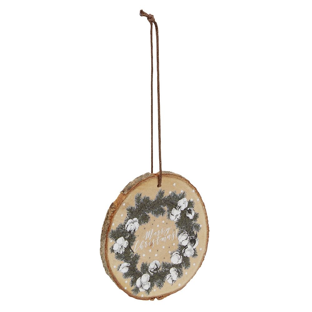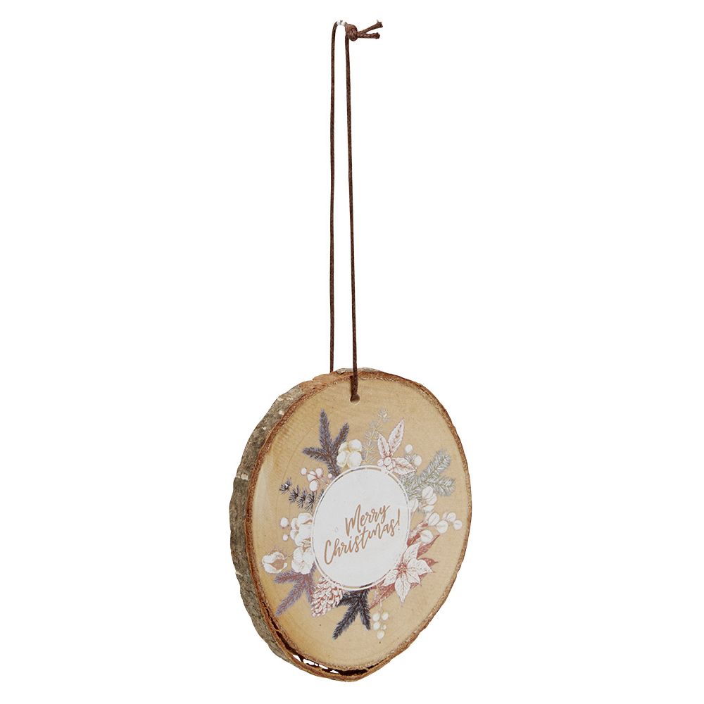 Round wooden decoration with winter flower motifs and a message wishing you a Merry Christmas, to hang on your tree.