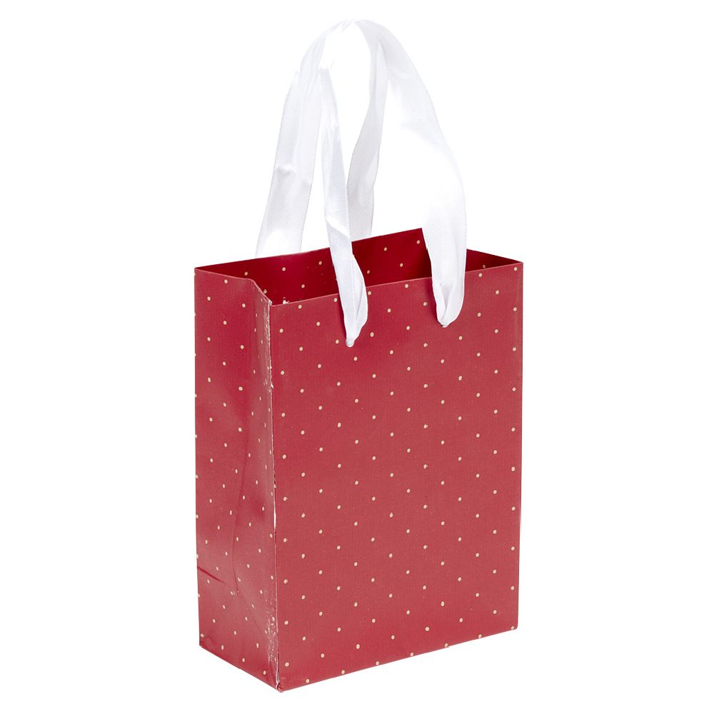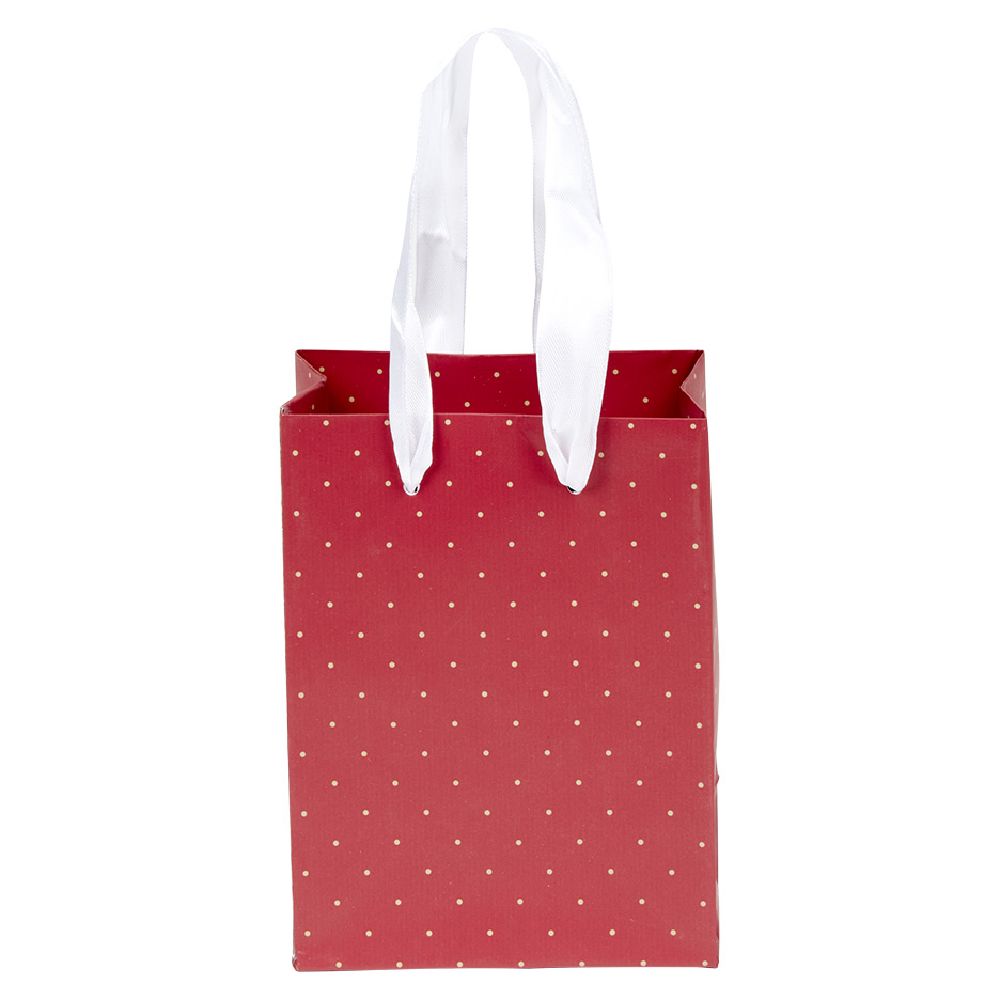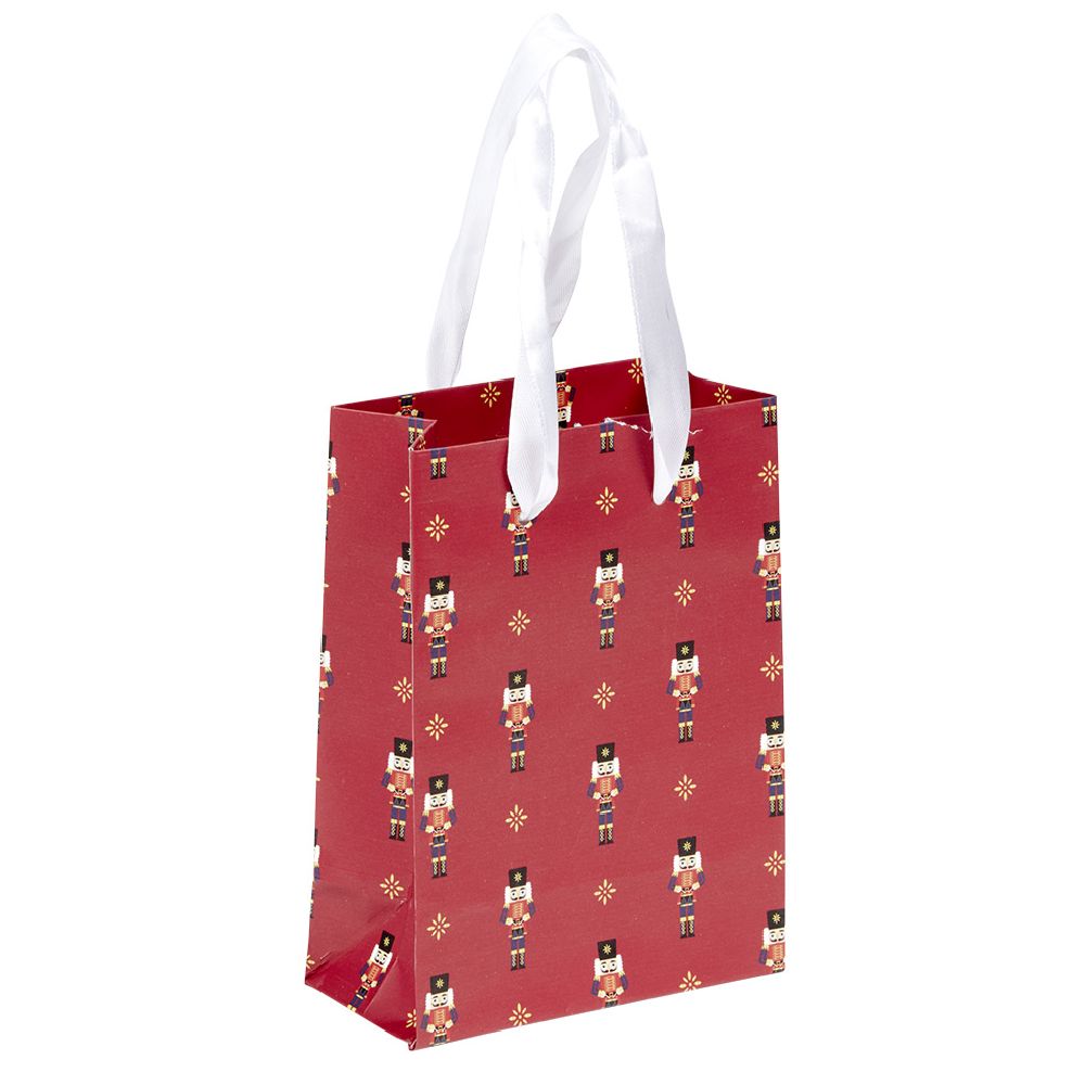 Christmas gift bag size S in different designs, one red with gold dots, another green and white tartan reindeer pattern, and the last red with gold pattern and Nutcracker soldier.