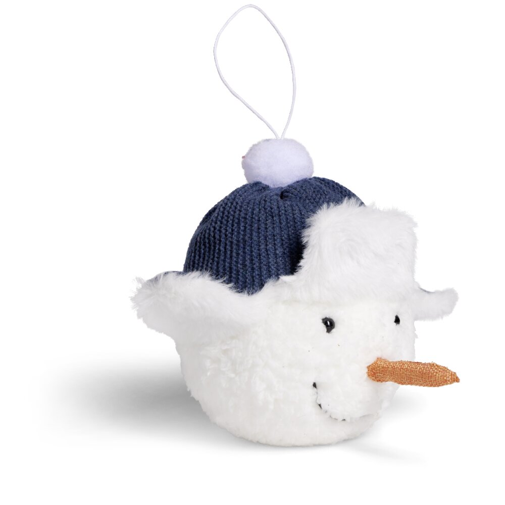 Add a festive touch to your decor with this white fur-effect snowman Christmas bauble with a blue hat.