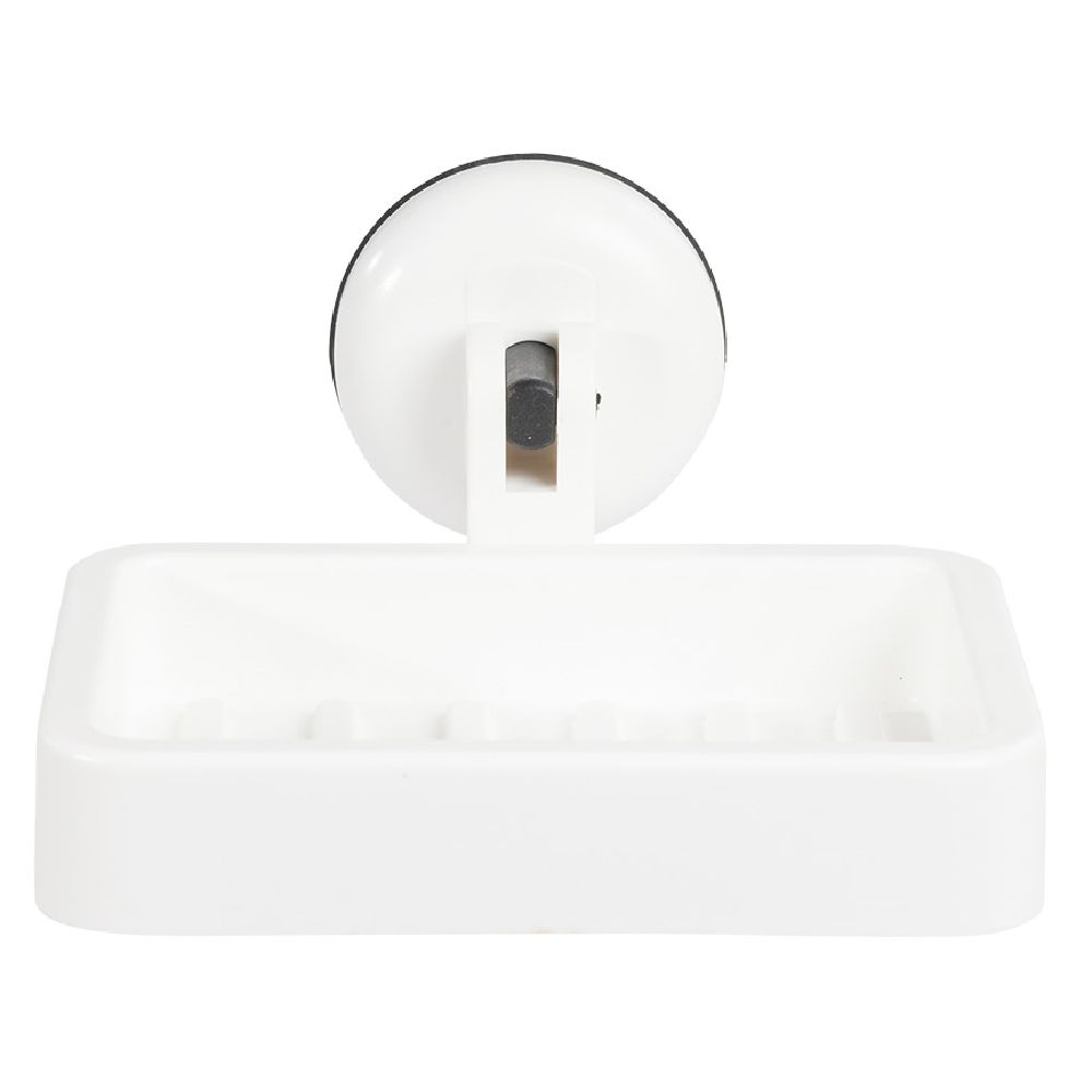 This practical white plastic soap dish can be attached without screws or drilling using its suction cup.