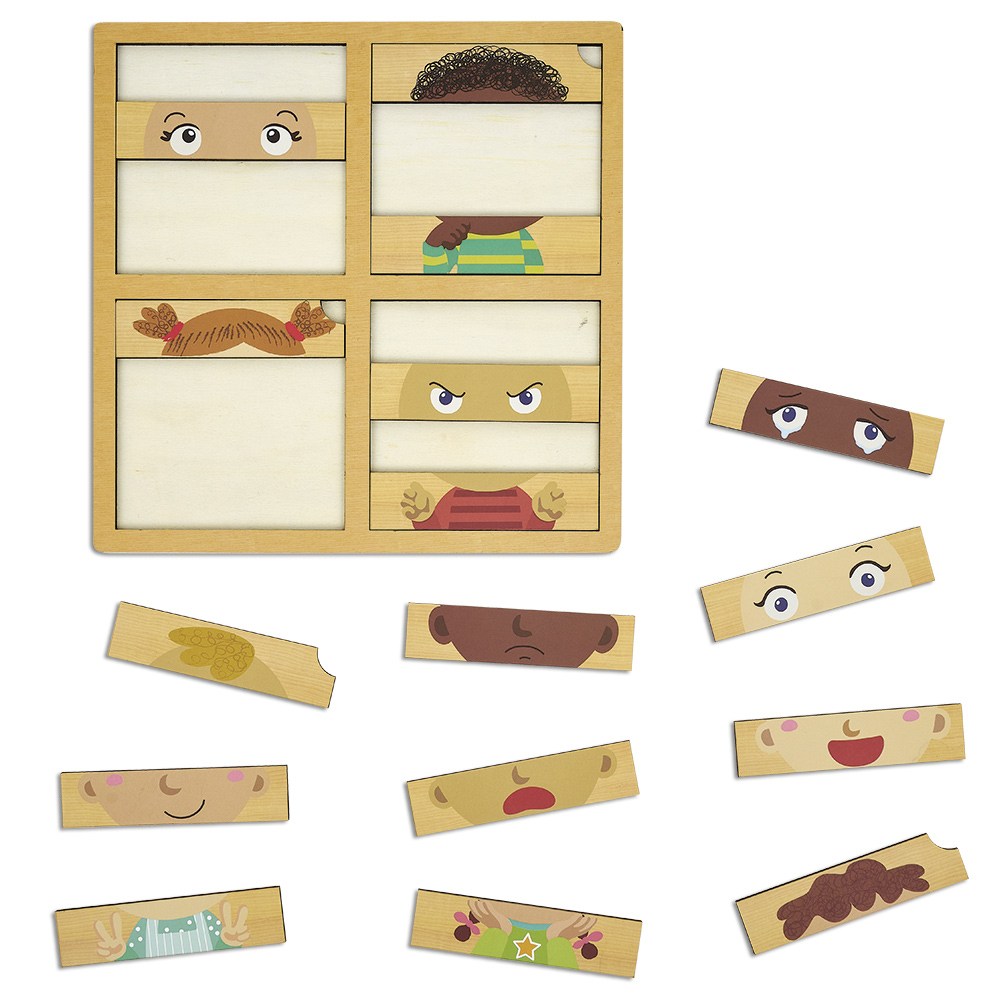Emotions puzzle made up of 16 wooden pieces with expressions to piece together. Fun and enjoyable to play, this game helps develop fine motor skills while learning about different emotions.