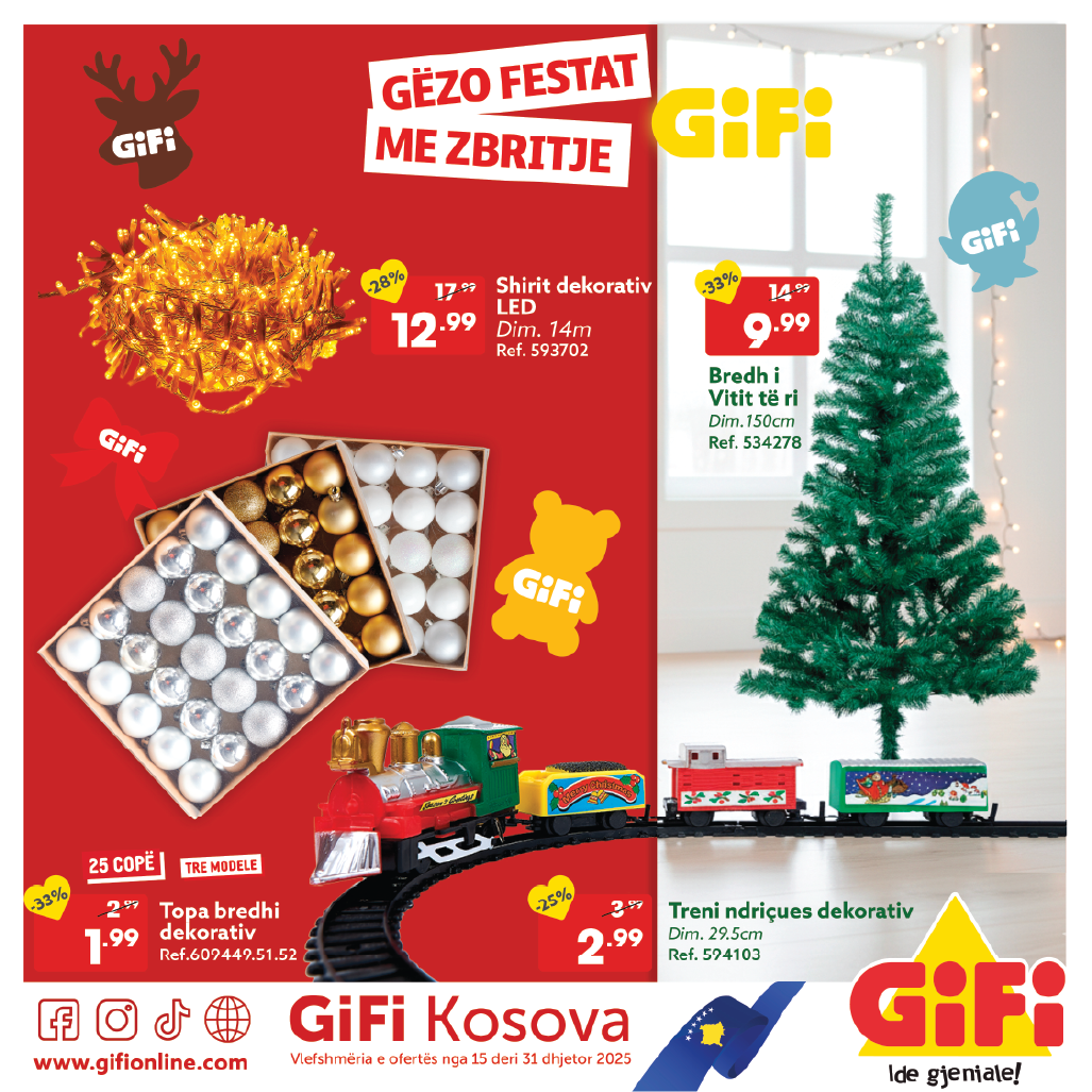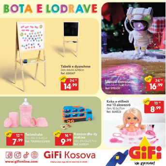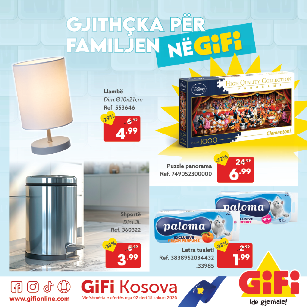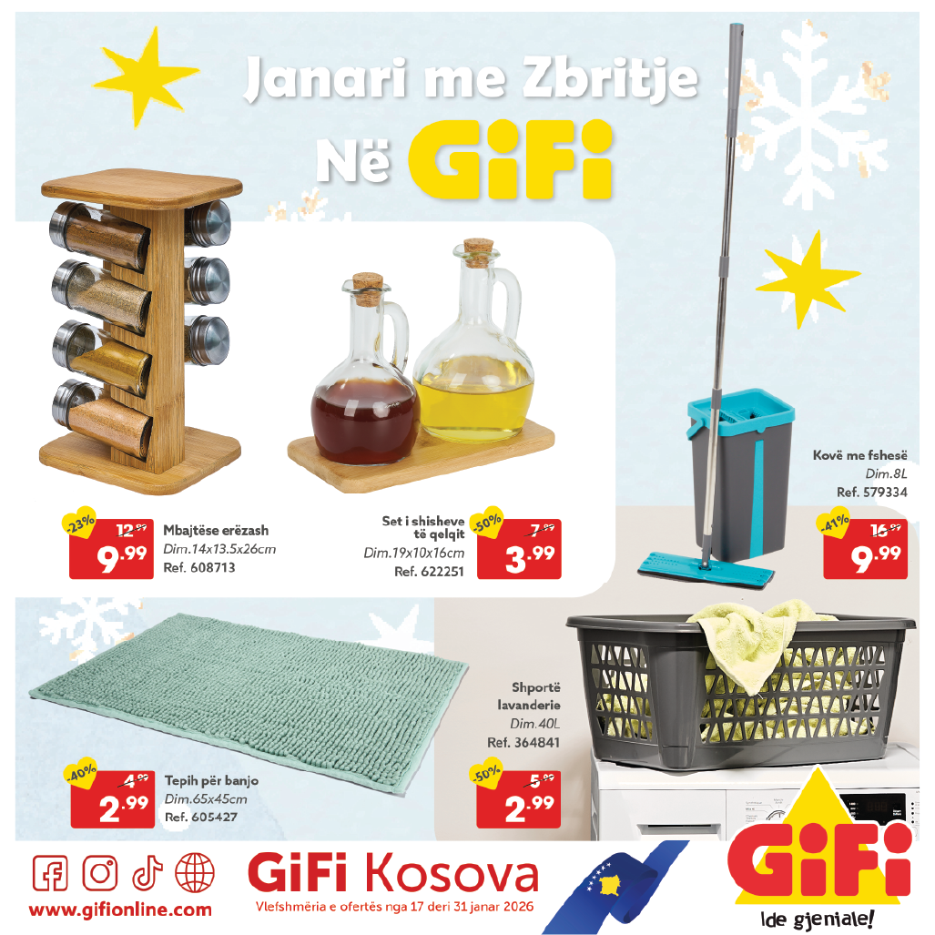 Në GiFi do të gjeni një përzgjedhje të pasur artikujsh me ulje çmimesh gjatë gjithë vitit: zbritje, likuidime, çmime të leverdishme dhe shitje me shumicë. Qoftë nëse jeni në kërkim të ideve për dekor, organizim të shtëpisë apo dhurata që do të gëzojnë fëmijët tuaj, GiFi është destinacioni i juaj. Përfitoni nga ofertat tona të shkëlqyera dhe nga raporti i favorshëm cilësi-çmim që na veçon. Kini parasysh: ofertat janë të kufizuara në kohë dhe stoqet mund të përfundojnë shpejt – andaj nxitoni!